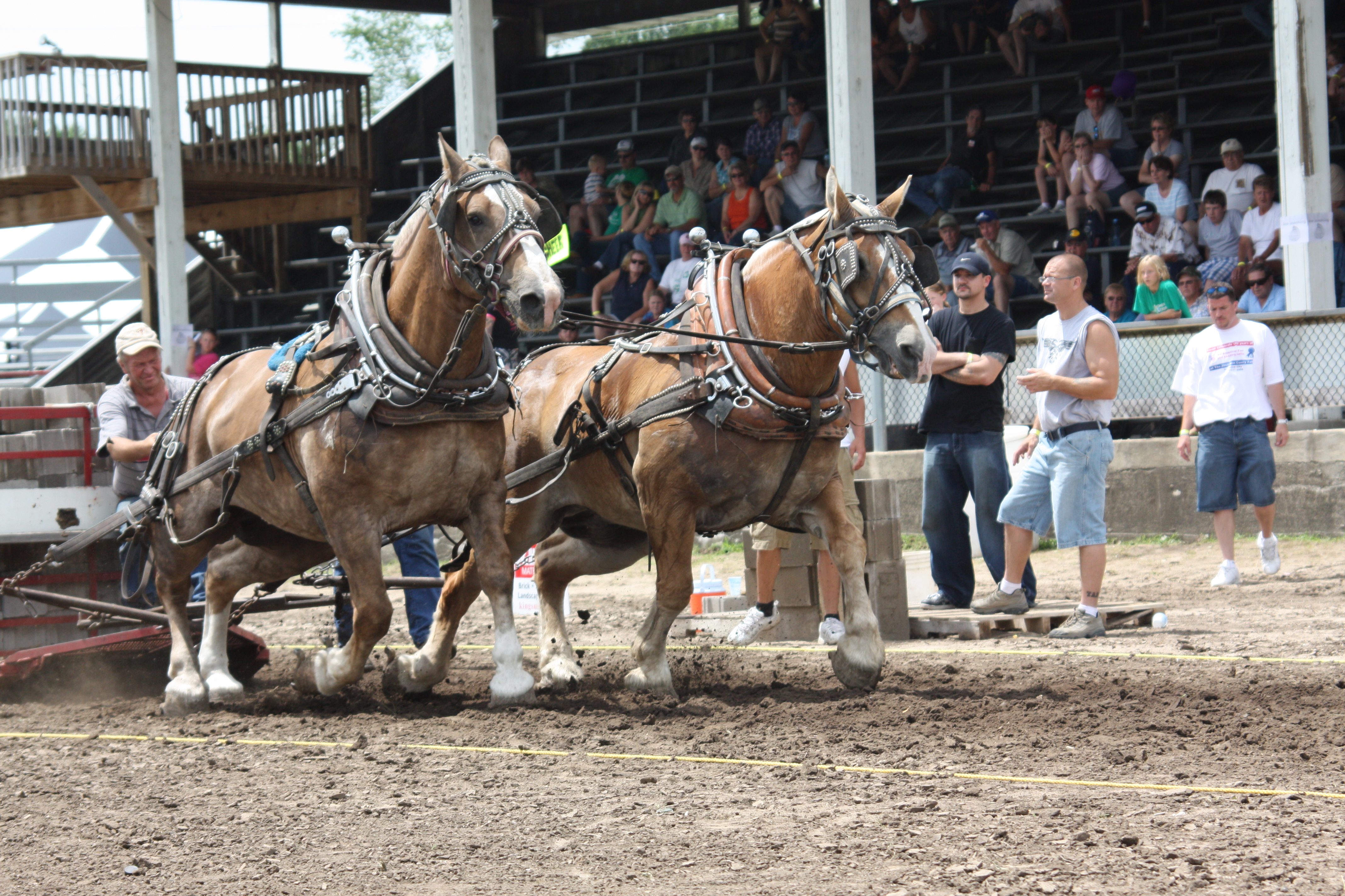 Dan – skidding building logs out of the woods with Big Bill, our 1,850 lb. Belgian draft horse.
