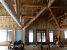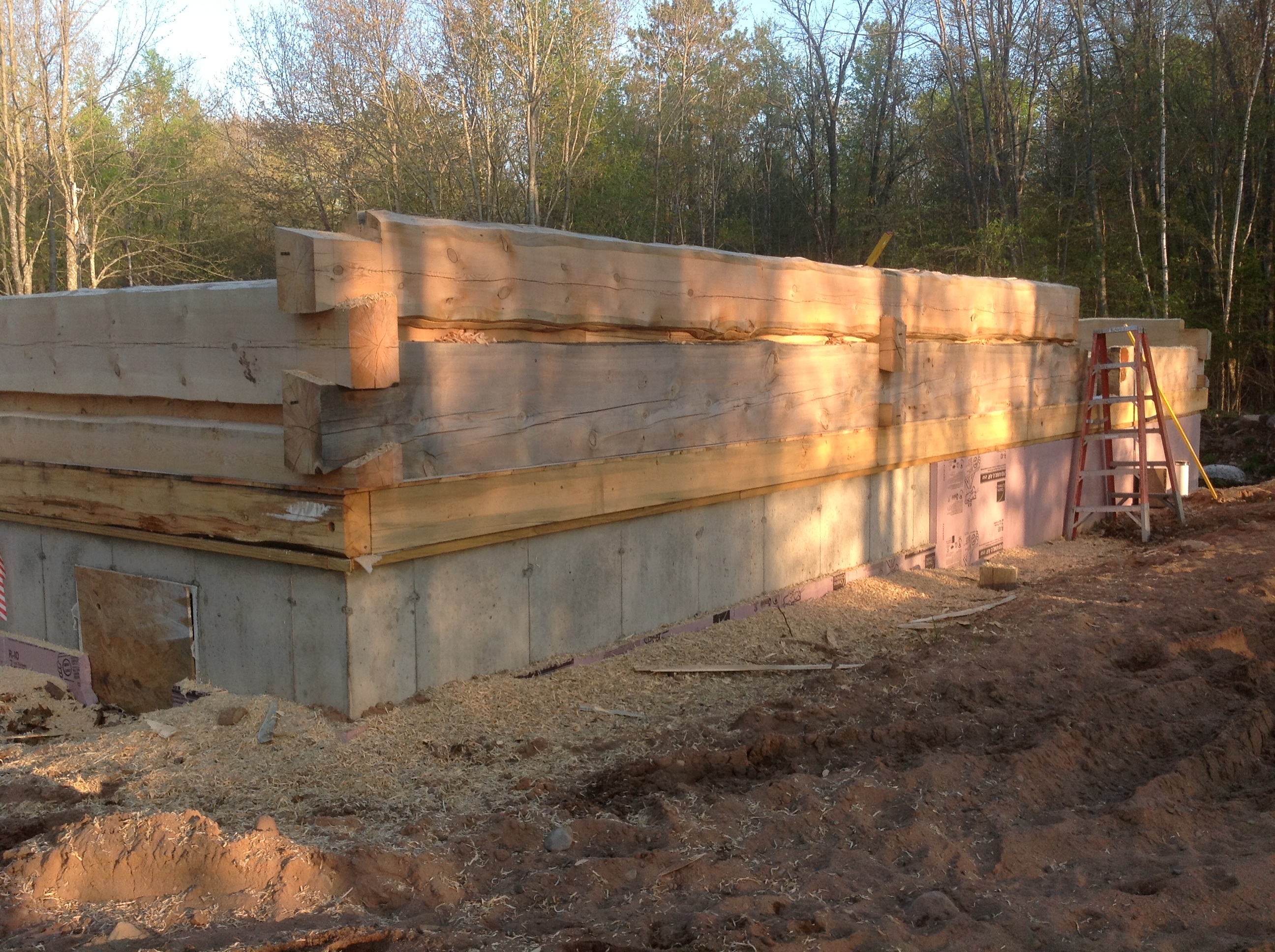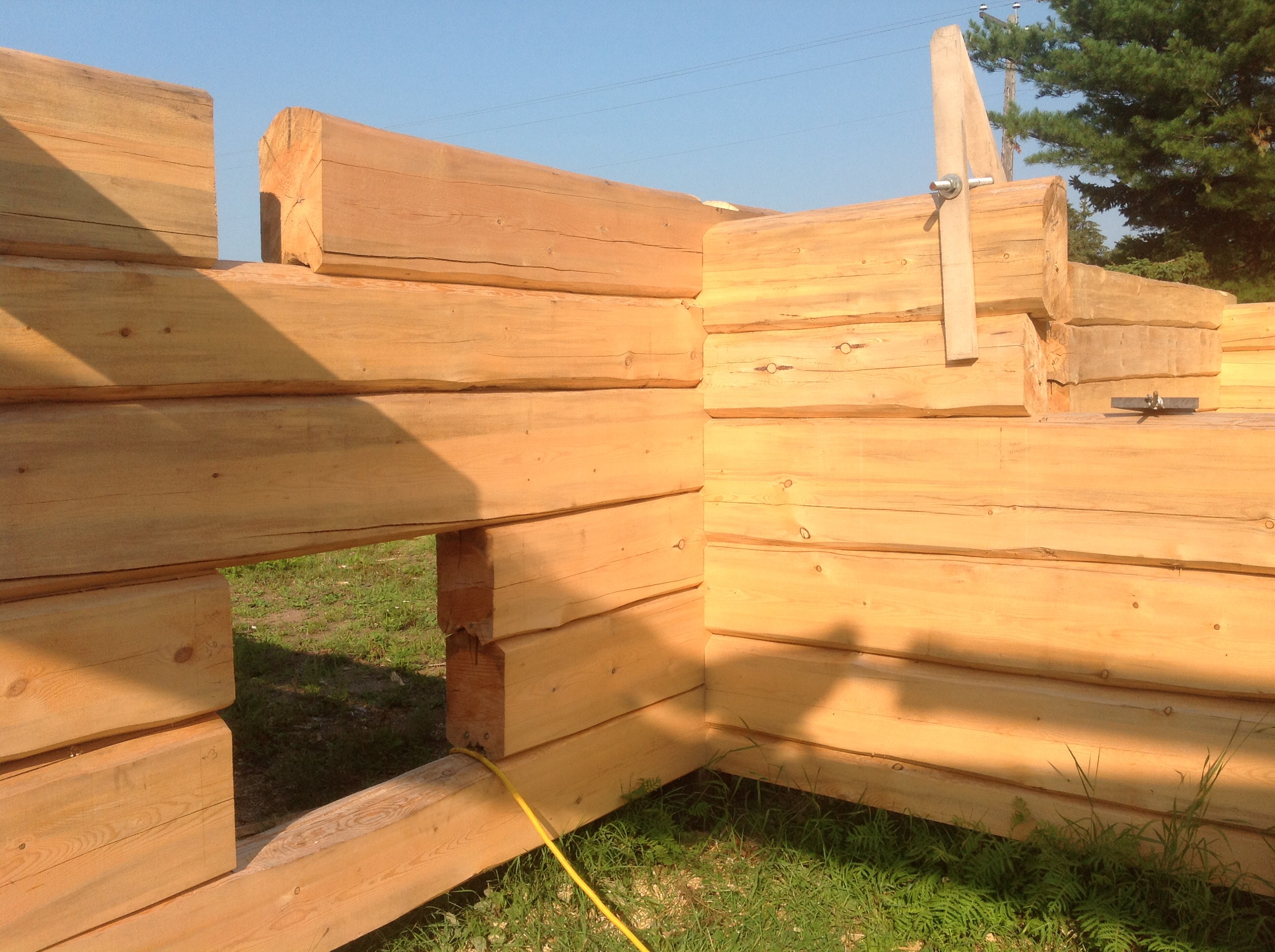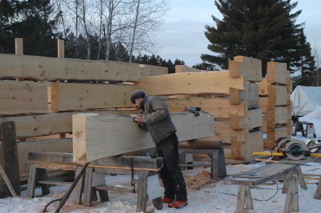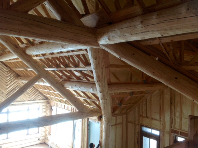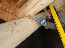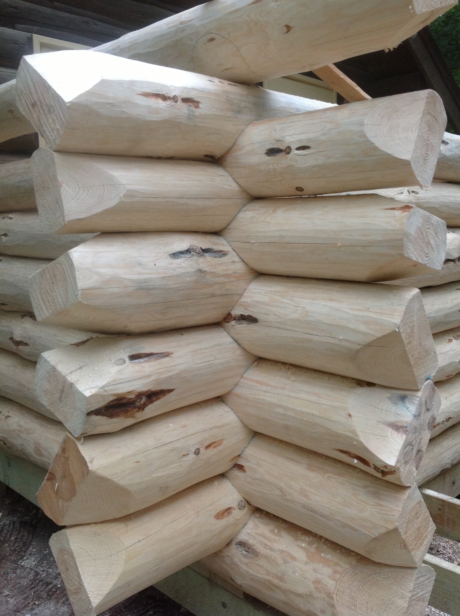 Last year, we built a 1700 sq. ft. hand crafted Scandinavian scribed home (on site, since it was located only six miles from our building yard) using Lodge Pole pine that had 11″-12″ tips and 16″ butts. Copes (bottom of log that has been cut away to fit over the log below) were filled with fiberglass insulation. Each log was pegged to the course below, approximately every 4′, with White Oak pegs.