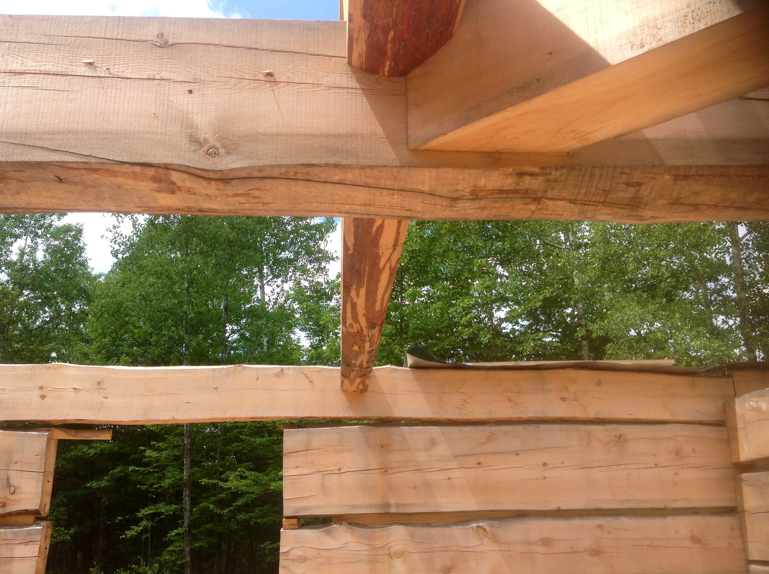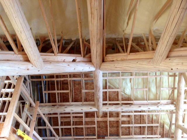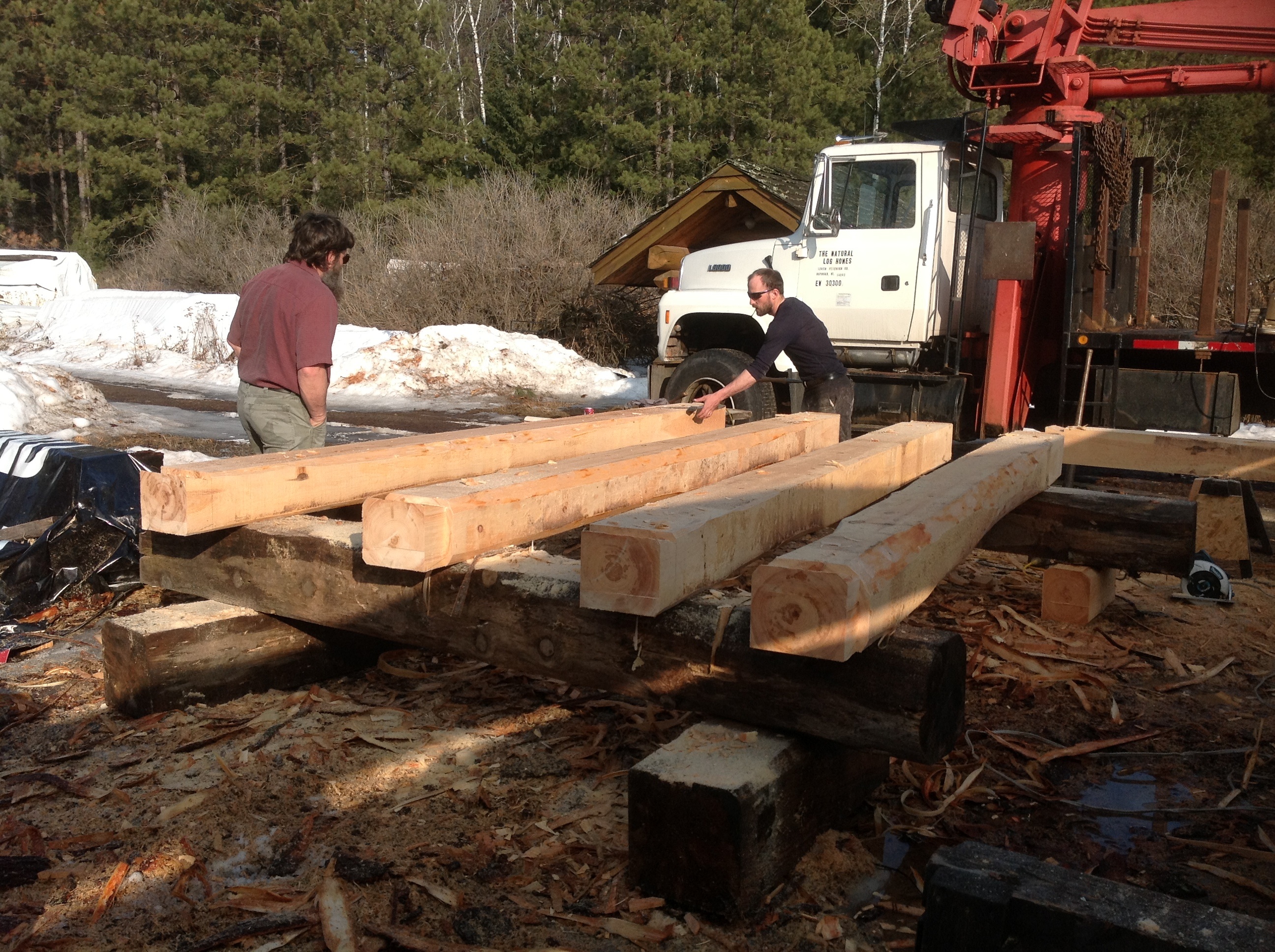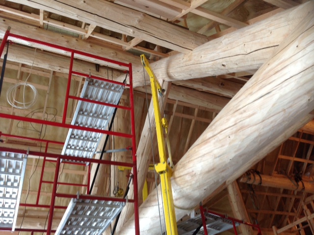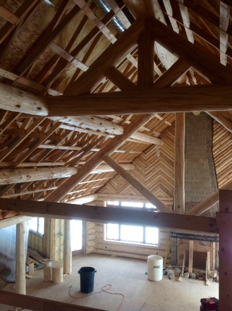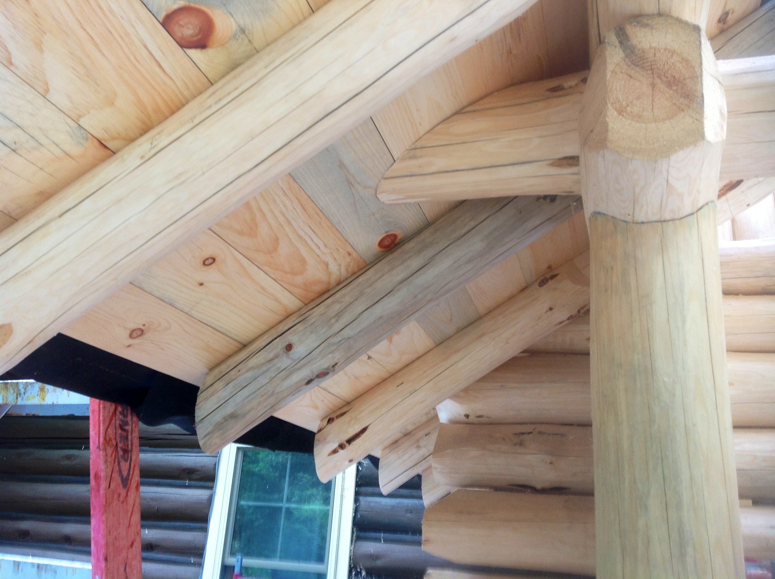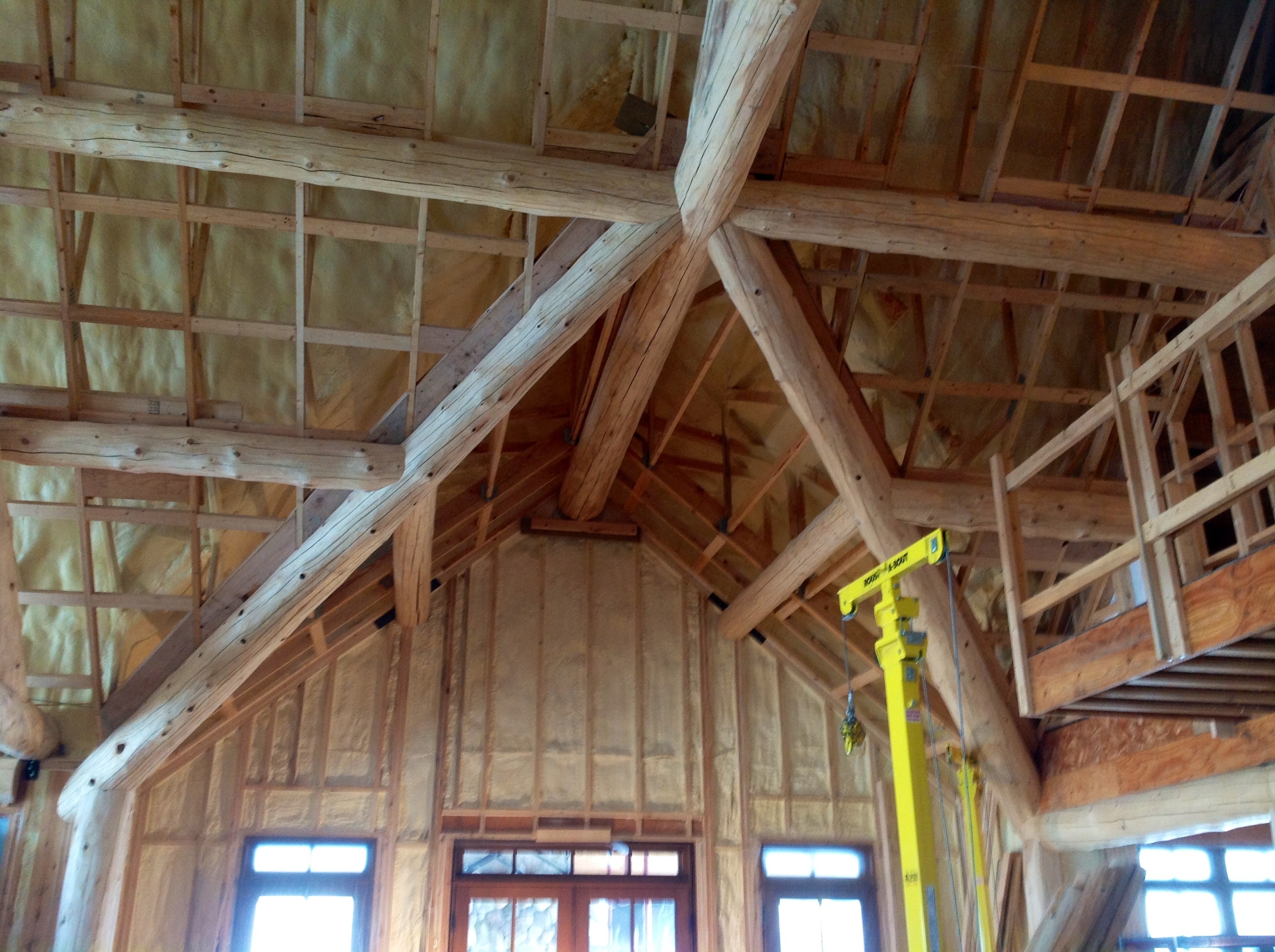 Last year, we built a 1700 sq. ft. hand crafted Scandinavian scribed home (on site, since it was located only six miles from our building yard) using Lodge Pole pine that had 11″-12″ tips and 16″ butts. Copes (bottom of log that has been cut away to fit over the log below) were filled with fiberglass insulation. Each log was pegged to the course below, approximately every 4′, with White Oak pegs.