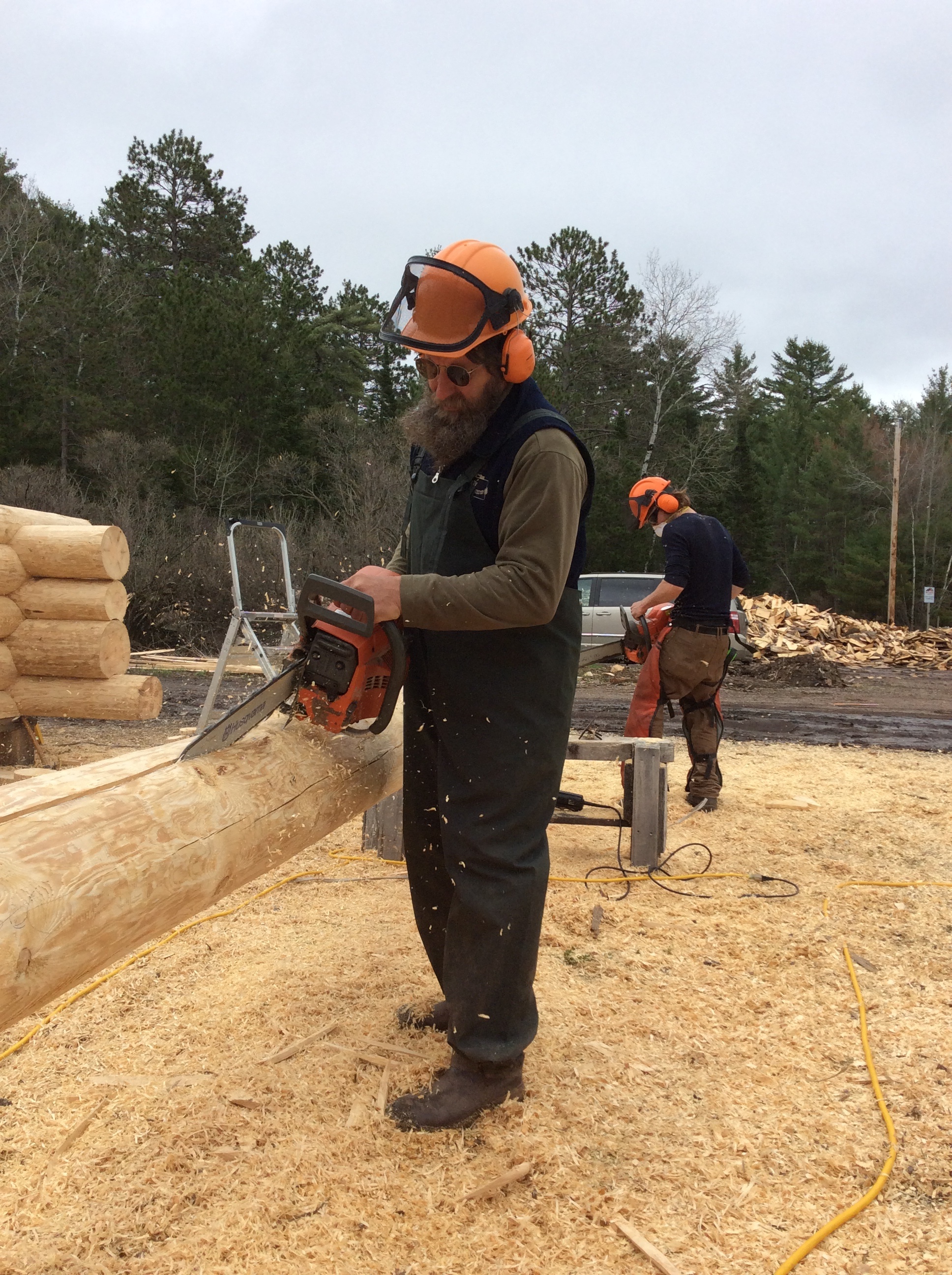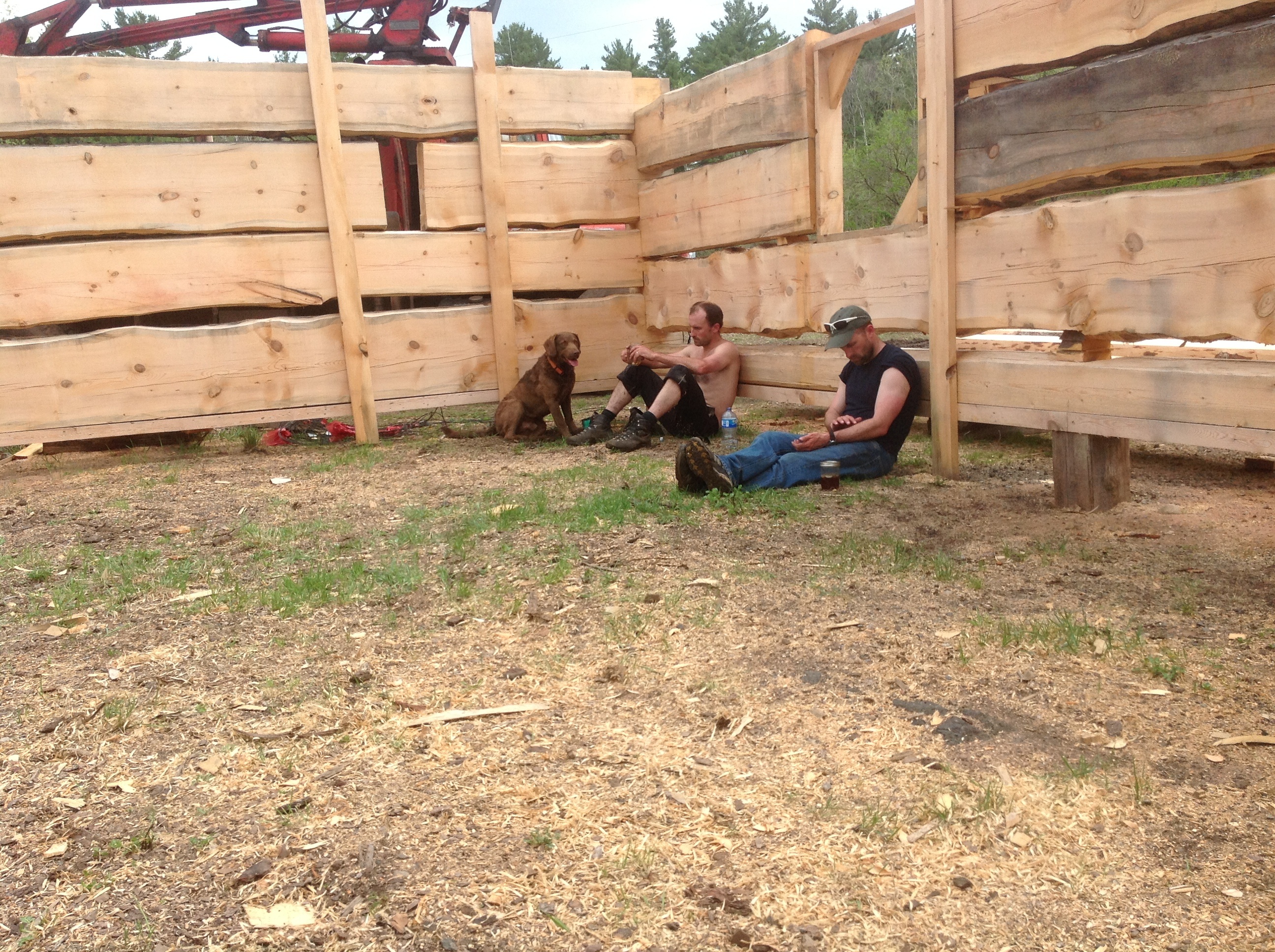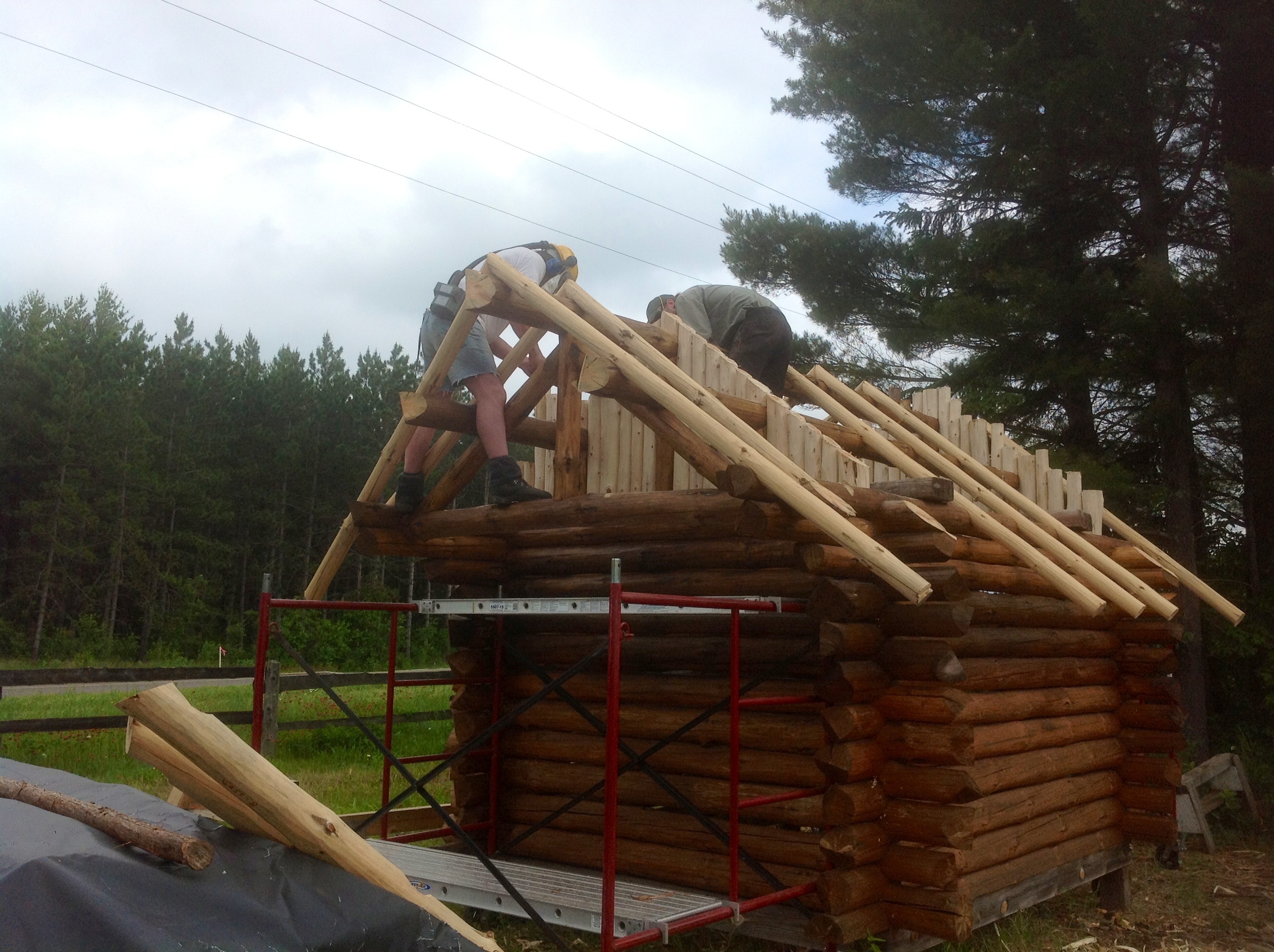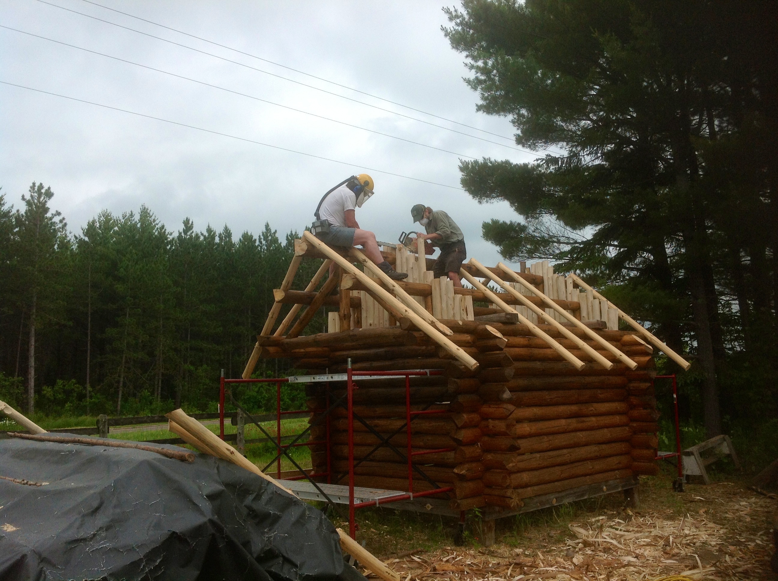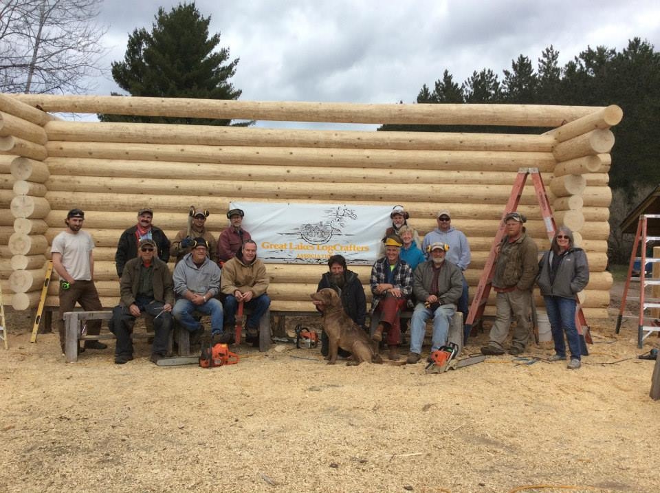 May 12th through the 17th, 2014 members of the Great Lakes Log Crafters Association built and sold a log cabin as a fundraising project at our log yard in Seeley, WI. The next few pictures are of our family working on some of the logs, and the finished project with all of the builders. National Geographic filmed our group during the building process that took five days!