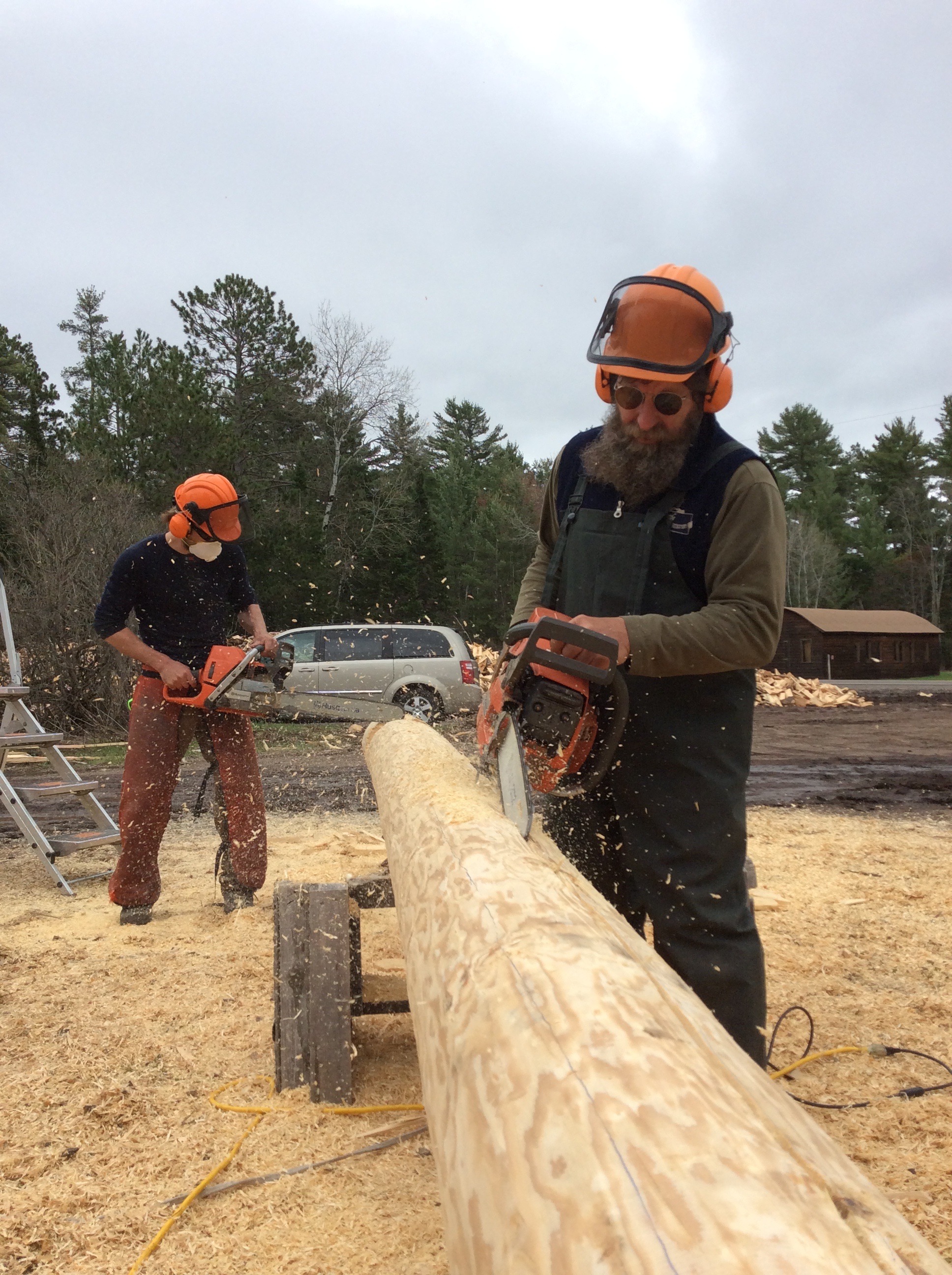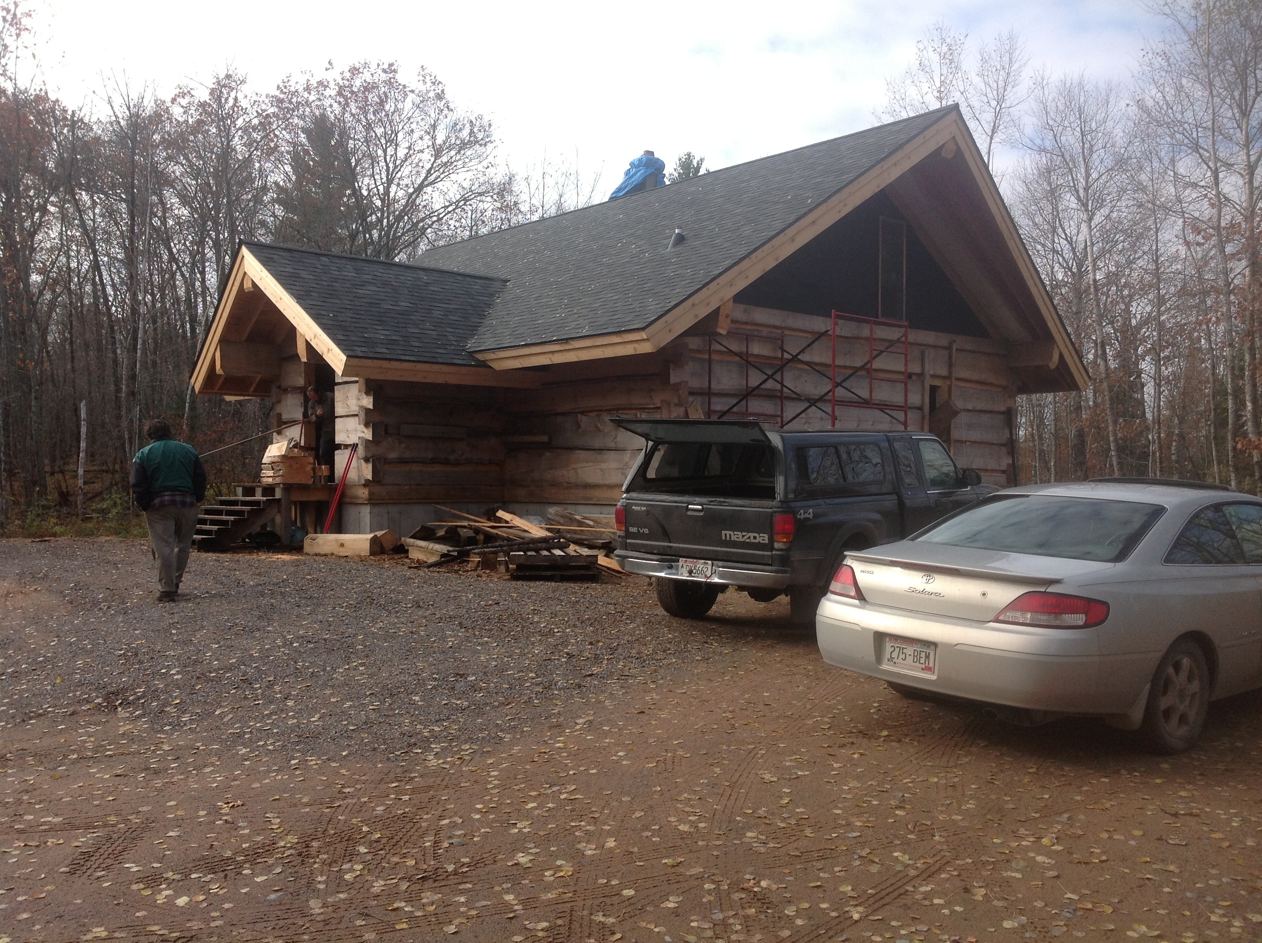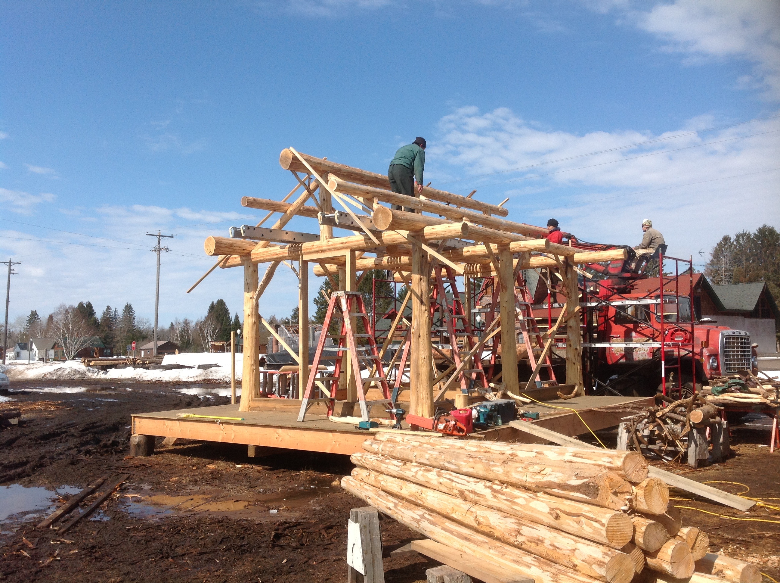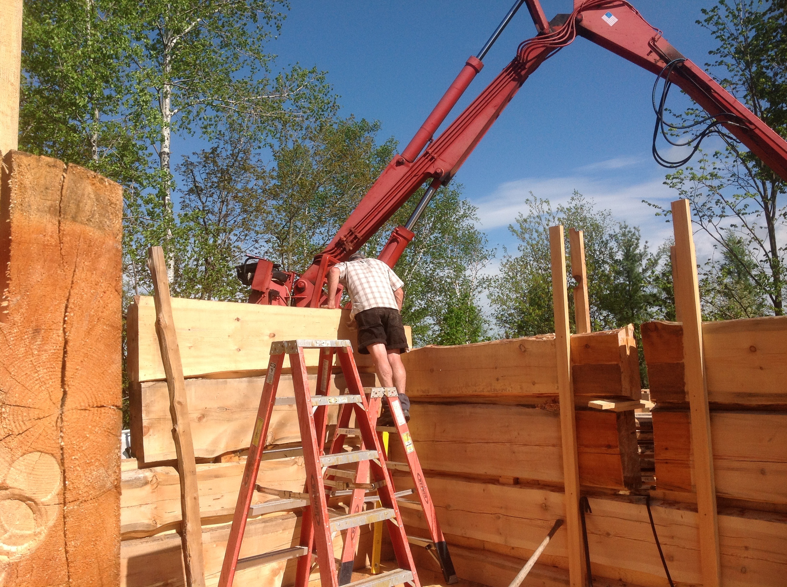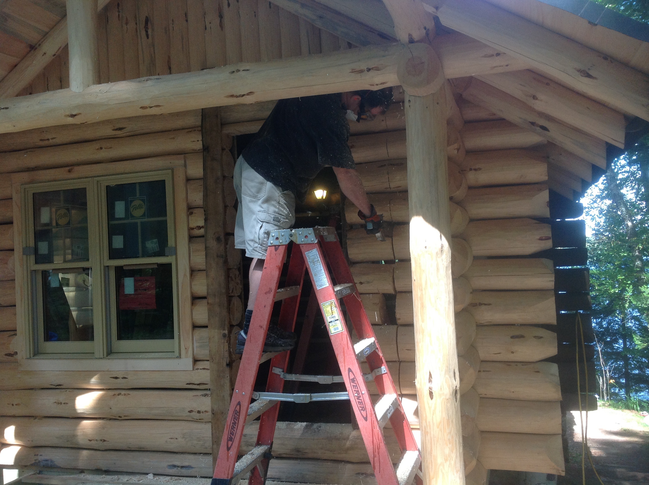 May 12th through the 17th, 2014 members of the Great Lakes Log Crafters Association built and sold a log cabin as a fundraising project at our log yard in Seeley, WI. The next few pictures are of our family working on some of the logs, and the finished project with all of the builders. National Geographic filmed our group during the building process that took five days!