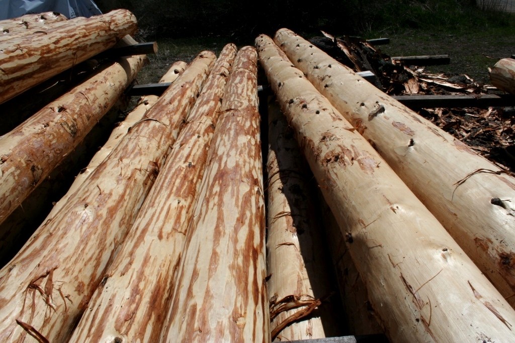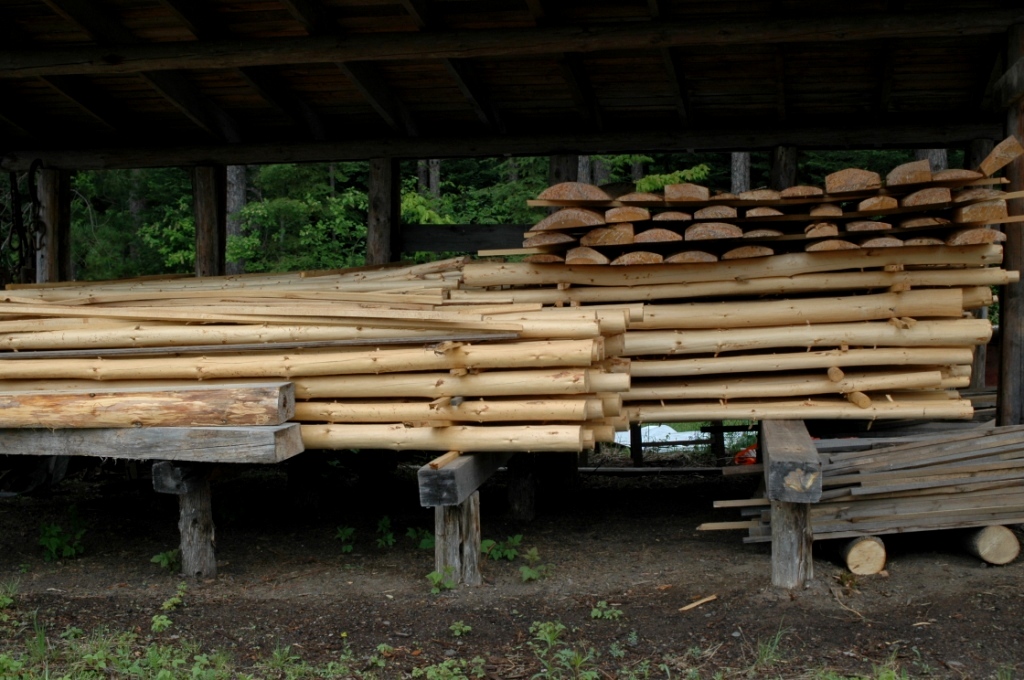 Our local logs are cut only in the winter, and peeled early in the spring.    Logs are then stacked in piles and covered with tarps to keep rain off, but still allowing for air to move through the logs